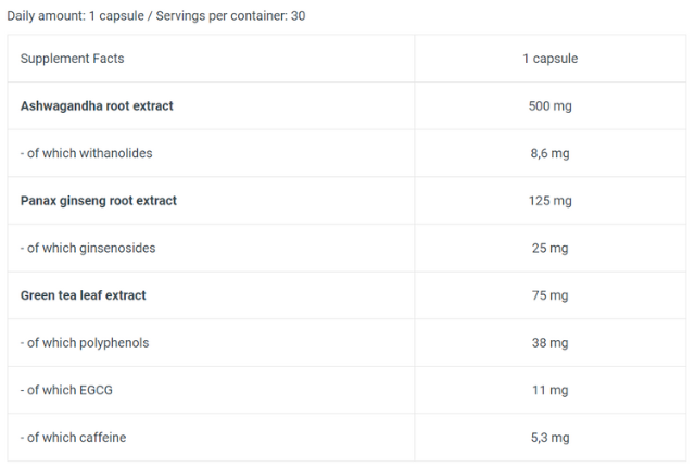 The product gets its name from the Withania somnifera, better known as Ashwagandha, also known as Indian ginseng. It is one of the basic plants of Ayurveda, its extract, which is a lactone, can be used for a variety of purposes. Additional ingredients include Korean ginseng, more specifically Panax ginseng, and the active ingredient extracted from its root is ginsenoside, which is a saponin. Last but not least, it also contains green tea leaf extract and its active ingredients, including polyphenols, including EGCG (epigallocatechin gallate), a catechin.