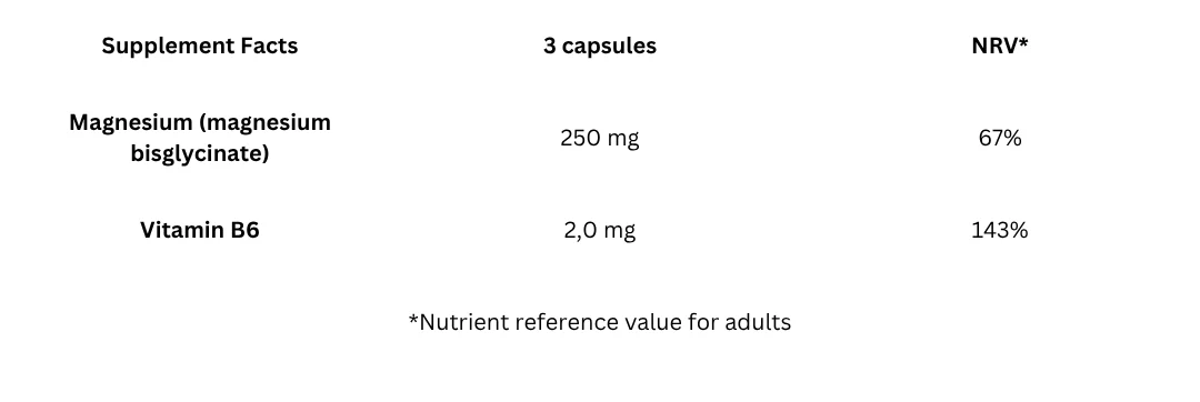 Nervous System: Magnesium and vitamin B6 contribute to the proper functioning of the nervous system and the maintenance of normal psychological function, supporting calm thinking, concentration, and better adaptation to stress.