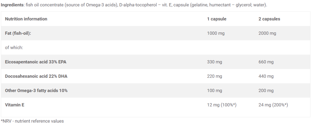 The top selling product of the Olimp Sport Nutrition brand, which is recommended for both competitive athletes and physically active amateurs, was enriched with vitamin E. The individual ingredients were tested for heavy metals and only raw materials of high quality were used in the production process, which indicates a high standard of production and safe use of the supplement containing Omega 3 fatty acids.