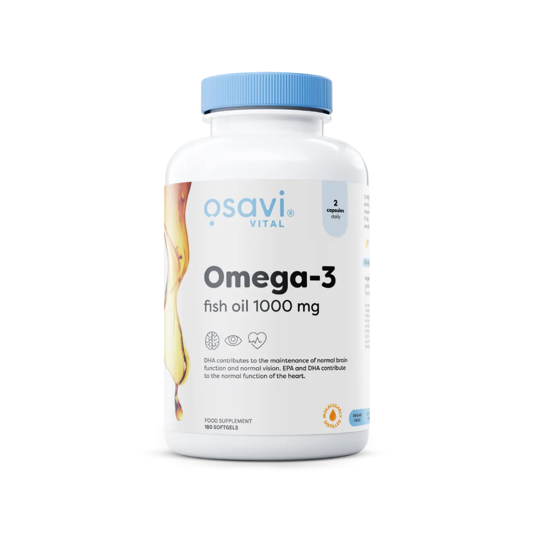 The Osavi product is a specially formulated omega-3 fatty acid concentrate derived from the oil of pelagic fish (anchovies) from sustainable fisheries in the Pacific Ocean. The supplement is produced and tested according to the GOED (World EPA and DHA Omega-3 Organisation) monograph, and the oil used in its production is certified Friend of the Sea. There are 1,000 mg of purified fish oil per capsule and 2,000 mg of oil in the recommended daily serving (2 capsules), including min. 700 mg of omega-3 fatty acids.The product has a high content of EPA (min. 360 mg) and DHA (min. 240 mg). Omega-3 fish oil 1000 mg is a supplement in soft capsule form providing the essential fatty acids EPA and DHA.