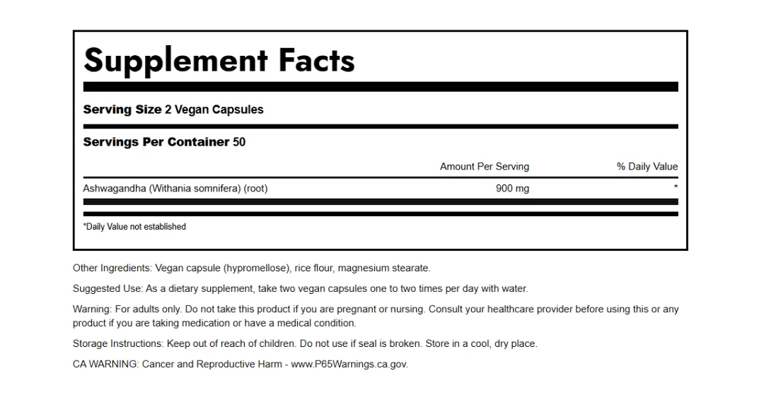 Κάθε εύχρηστη κάψουλα περιέχει 450 mg καθαρής ρίζας ashwagandha, με φυτικής προέλευσης συστατικά και χωρίς περιττή επεξεργασία.
